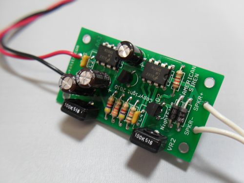 This is the fully-functional American Siren Kit with Bullhorn. This kit will produce a very loud sound very similar to an American Police siren. It uses two LM555 Timers to create this sound which has two adjustments. One adjustment is for varying the rise and fall times and the other is for varying the tone. Use this anywhere you would like the sound of an American Police siren. The PCB is a small 1.20" long x 2.20" wide and has four mounting holes. The PA Horn is an MPI-8 8-Ohm speaker rated for 15 Watts peak. It comes with a metal tilt mounting base. You will get a fully functional American Police Siren, a wall-mount power supply, and a PA Horn that will drive you crazy. Mount the PCB anywhere and put an on/off switch in series with the dc power from the provided power supply and run the PA Horn to where it will cause the most havoc. This will definitely get everyone's attention. Have fun!!