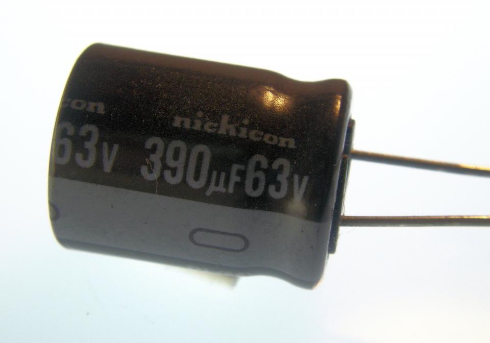Aluminum Electrolytic Capacitor - Radial 390uF @ 63v 105 degC Diameter = .640" Length = .820" Lead Spacing = .300" Manufacturer = Nichicon
