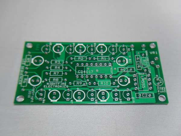 This is the LED Sequencer #1 Kit. This is a neat circuit that lights up 10 LEDs in sequence. The circuit includes an adjustment for speeding up or slowing down the LEDs. Use this in a bunch of different places.