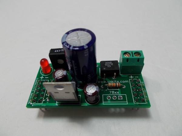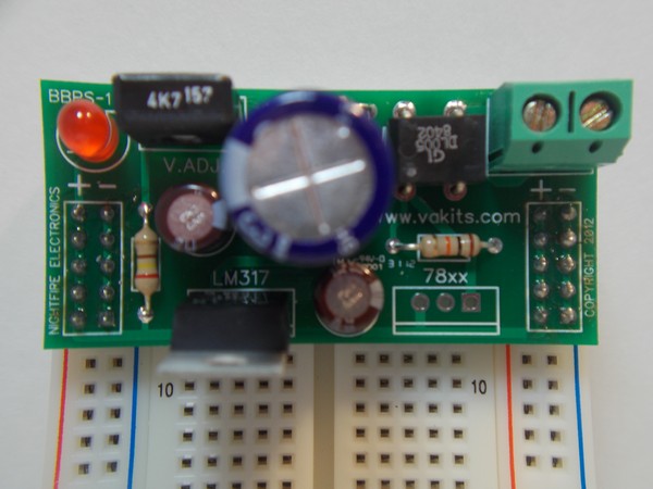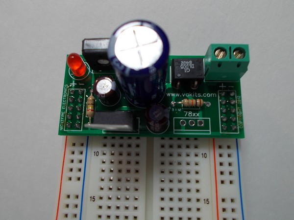 It was designed by us to neatly fit on the common Solderless Breadboards which is a very handy thing to do. It will convert an AC input into a DC output. It will also convert a large DC input into a smaller DC output. This is an extremely versatile PCB.