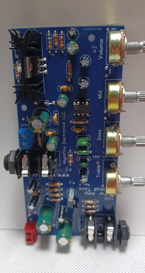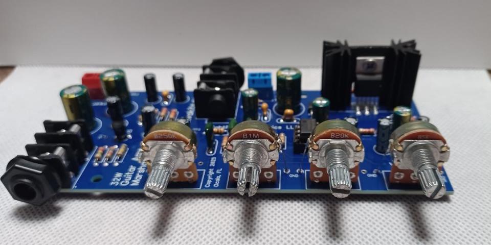It will accept your guitar input via a 1/4" phono jack. The input is a very-high impedance FET circuit. The guitar sound is then routed thru a Marshall Tone Stack with Bass, Mid and Treble controls. The Marshall Tone control portion uses Mylar (Metalized Polypropylene) Film capacitors for excellent audio characteristics. It is then fed to an OP Amp pre-amplifier with external frequency compensation for frequency stability prior to going into a Class AB, 32-Watt audio amplifier. Connect the output to your speaker cabinet for a neat experience. It will drive a 4 or 8 Ohm speaker, 25 watts or better. The PCB is approx 3.8" wide x 4.8" deep.