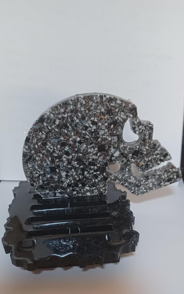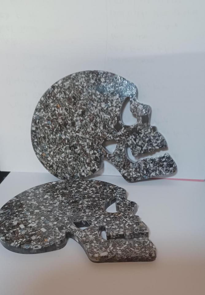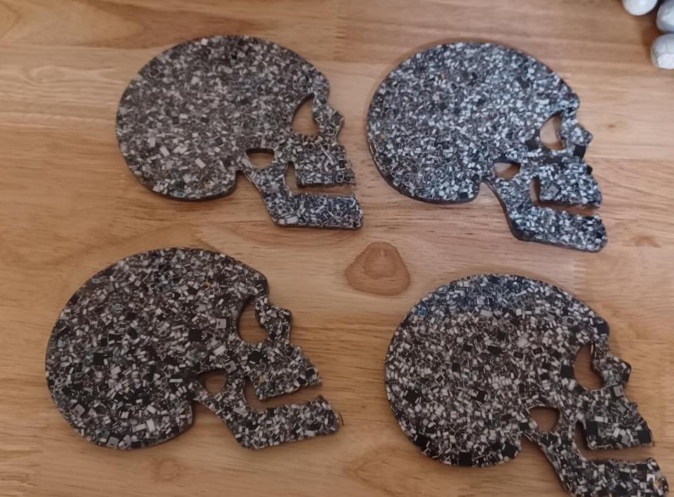 Have your own unique, handcrafted SMT Skull Coasters with stand. These coasters are one of a kind and made individually. Each coaster is made of thousands of SMD parts with a resin filler so the patterns and colors will vary slightly. You will recieve 4 coasters and 1 black stand.